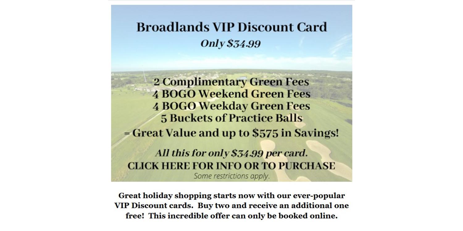 The VIP Discount Golf Card is available now through Broadlands' online store and at the golf shop. With the card in hand you'll be able to book tee times online or by phone, take advantage of the savings, and be part of a community of players committed to enjoying quality golf without the premium price. Visit https://broadlandsgolfclub.square.site/product/broadlands-vip-discount-golf-card-1-/ for full details and to secure your VIP Card.